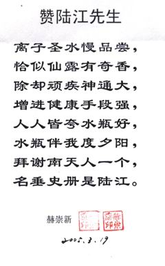 凡尊重中國古代養(yǎng)生智慧的患者,堅持“已饑方食”和定時主動補水者,均可祛病康復。如牡丹江醫(yī)學院87歲的張鵬圖飲用半年后高血壓未痊愈,陸江與他通話交流,了解他原先每日主食4兩,建議他用“已饑方食”減少主食肉食量,他理解后,將每日主食減為3兩,少吃兩塊肉,飲用一年治愈26年的冠心病和高血壓。他2003年5月31日來信說:“飲用卓康小分子團水是根治高血壓、冠心病、糖尿病的一把金鑰匙,是填補醫(yī)學空白,為人類造福,應推廣該產(chǎn)品。”
