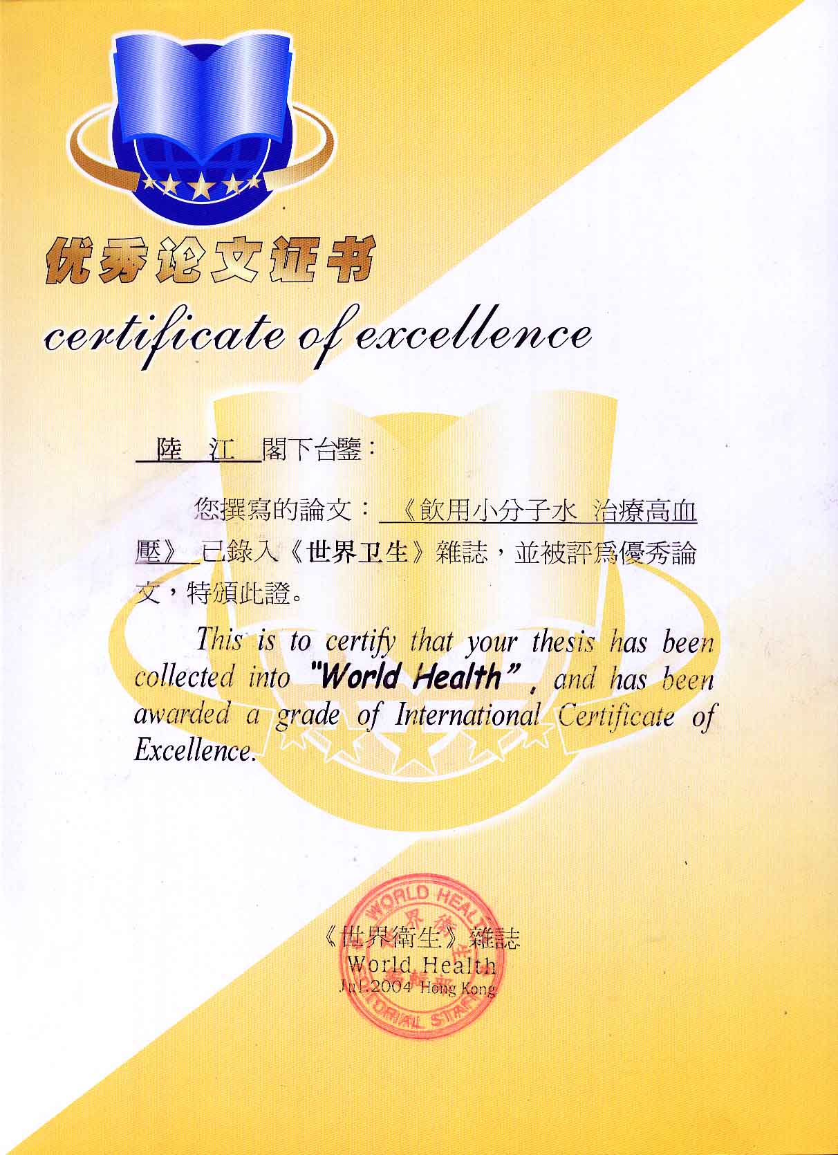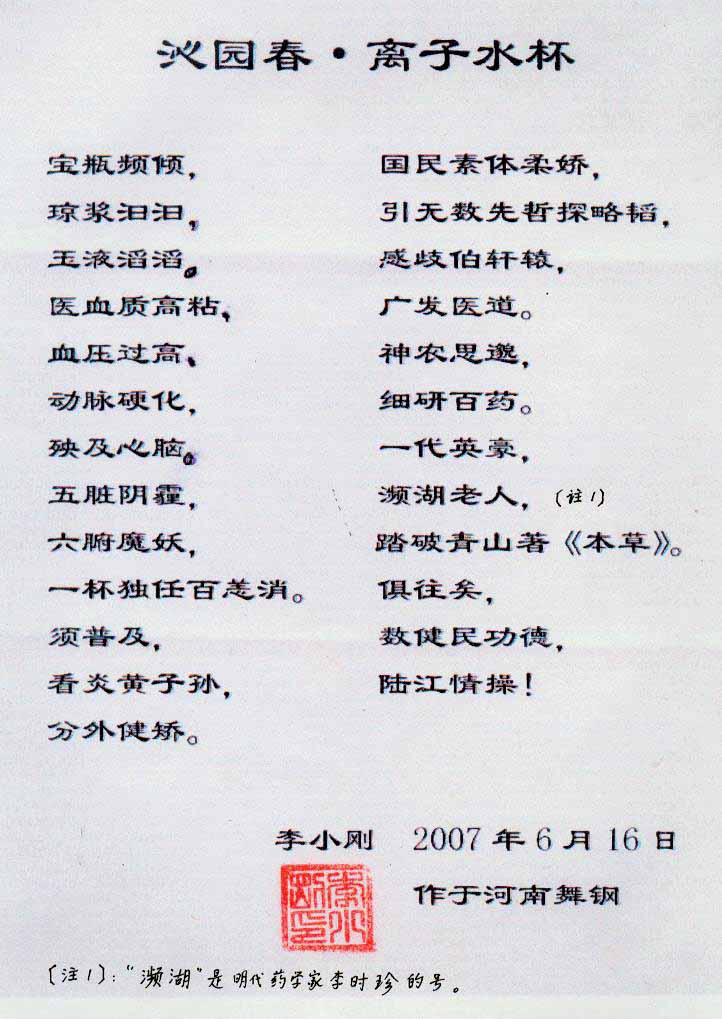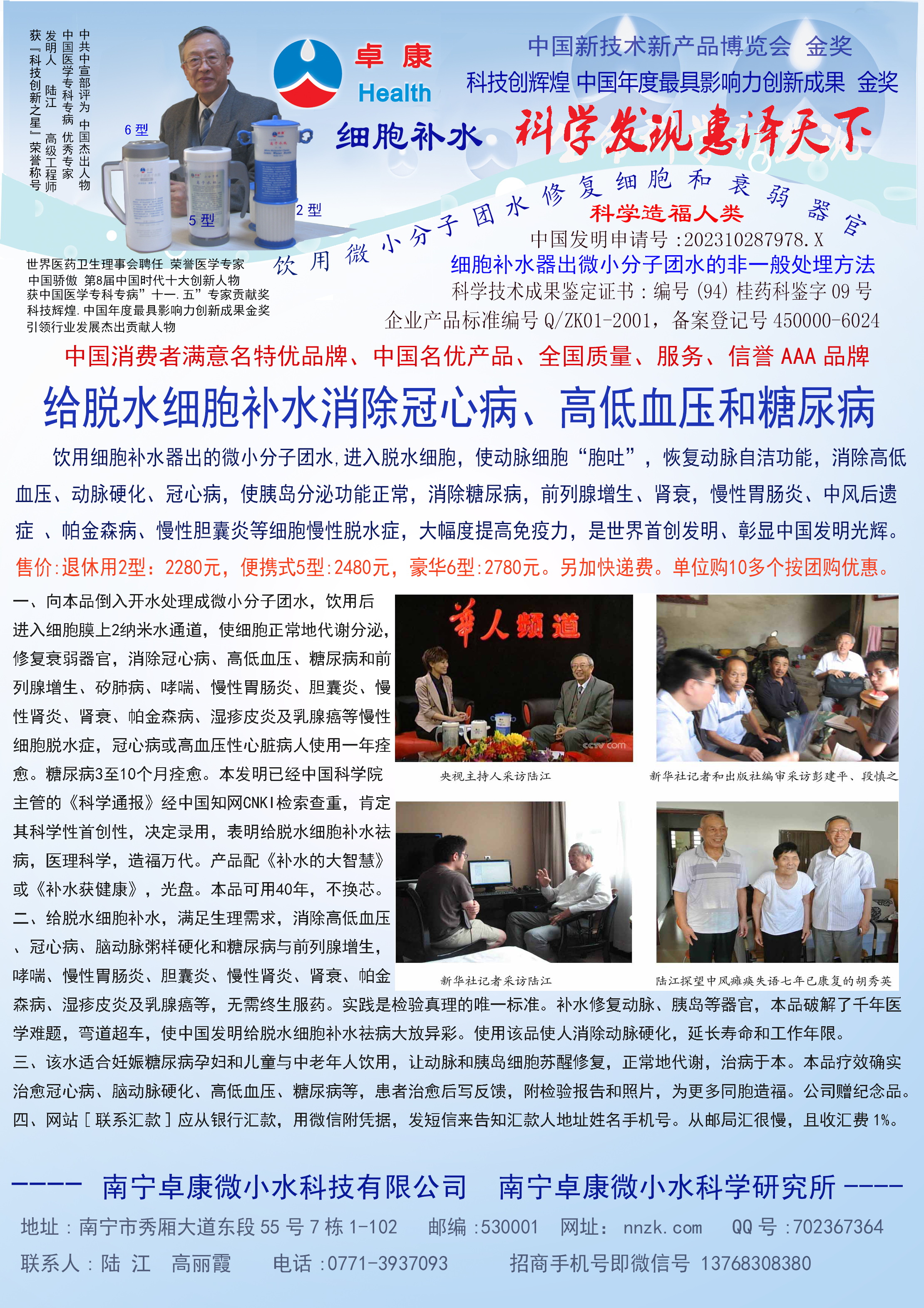 -----我是從事建筑的高工,本來沒有資格去攻克醫(yī)學難題,卻為了自身健康才扣響醫(yī)學的大門。由于我1990年患高血壓,因怕中風才研究發(fā)明了離子水瓶,我把水處理成微小分子團水,飲用后治愈了高血壓。便于1993年底送到三家省級醫(yī)院做臨床試用4個月。經(jīng)北京和廣西醫(yī)學專家鑒定:"降脂降壓效果好"," 能擴大心腦動脈流量,改善心腦電圖以及微循環(huán)","對治療心腦動脈粥樣硬化、高血壓、高血脂有良好的醫(yī)療保健作用。""產(chǎn)品的技術(shù)性能和療效達到了同類產(chǎn)品的國內(nèi)領(lǐng)先水平,經(jīng)廣西醫(yī)學科學情報研究所檢索,未見國外有類似報道。"中國醫(yī)學科學院張正國教授從美國國立醫(yī)學圖書館數(shù)據(jù)庫存Medline檢索英俄文資料,均未見類似報告。2000年上市后,我為了對消費者負責而繼續(xù)觀察研究,一直通過《信譽卡》和《質(zhì)量跟蹤調(diào)查書》向患者承諾療效,請用戶使用6個月后反饋效果。和脂壓患者飲用2至5個月內(nèi),消除癥狀,停服藥物,血壓正常;冠心病患者飲用3~5個月逐漸減輕至消除心絞痛、房顫等癥狀,不再服藥,飲用1年左右心電圖正常,經(jīng)冠脈造影掃描無明顯狹窄,表明冠心病痊愈。大量患者還反映許多衰弱器官被修復,讓前列腺增生、慢性咽喉炎、慢性氣管炎、支氣管炎、慢性胃炎、腸炎和膽囊炎等不藥而愈;2型糖尿病患者是因為胰島衰弱致病,飲用該水半年至一年,逐漸減藥至停藥,血糖尿糖正常,真正治愈2型糖尿病。中風后遺癥患者飲用六七個月,可逐漸減輕至消除肢體和語言障礙,表明飲用該水能讓壽命很長的神經(jīng)元細胞逐漸修復,奇跡般地恢復肢體和語言功能。飲用后還使胸腺和脾臟兩個重要的免疫器官被修復和增強,產(chǎn)生免疫細胞多,提高了免疫力,使人不生病或少生病。自此, 飲用微小分子團水創(chuàng)造了攻克冠心病、高(低)血壓和糖尿病三大醫(yī)學難題的奇跡。人們對此感到不可思議,但實踐是檢驗真理的唯一標準。