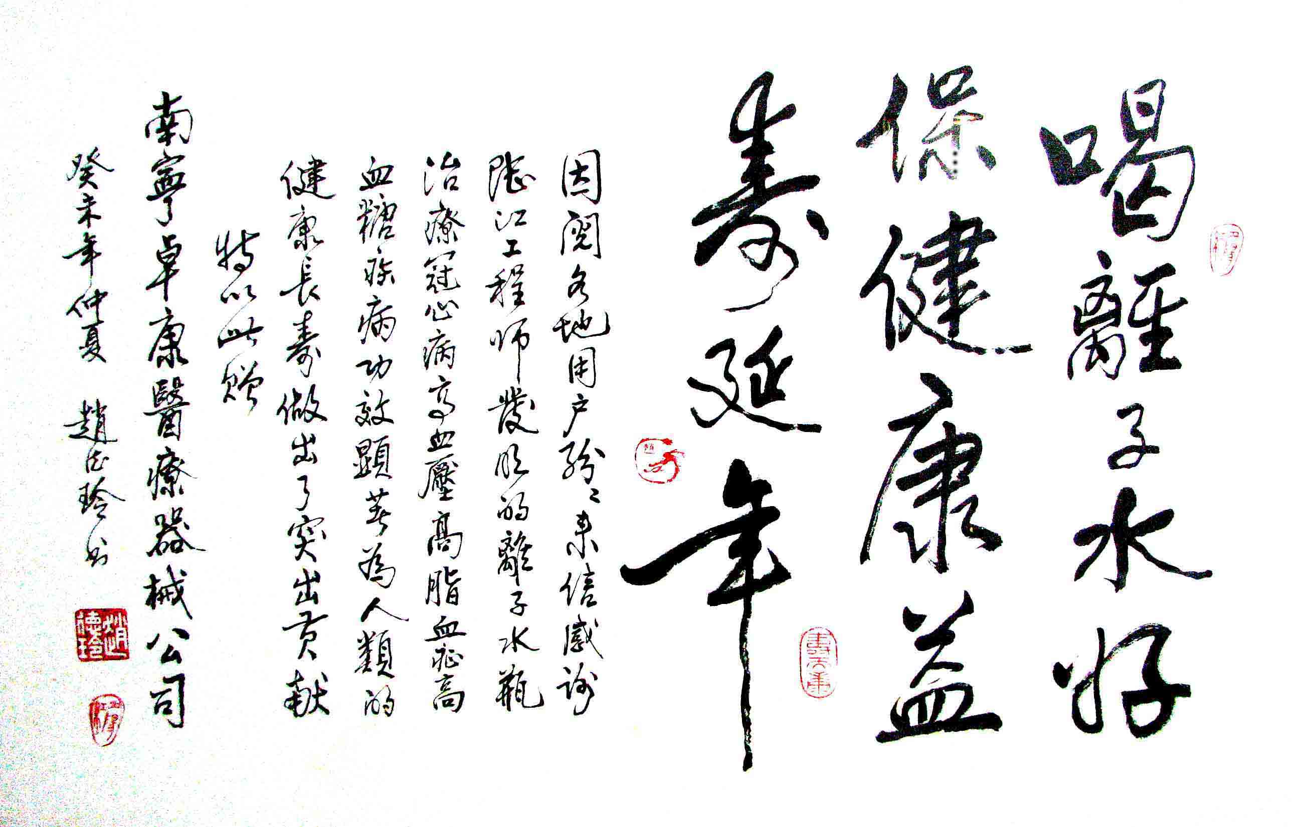 - -- 幾千年來,人類靠醫(yī)藥不能根治冠心病、高血壓和糖尿病,如想根治,那是夢想。可是,我從中國基礎(chǔ)醫(yī)學研究成果受到啟發(fā),研發(fā)了一種發(fā)明產(chǎn)品,處理出微小分子團水讓人飲用,實現(xiàn)了人類這一夢想!患者飲用后遠離了冠心病、高血壓和2型糖尿病。這一成果曾經(jīng)過臨床試用和專家鑒定,作為準字號醫(yī)療器械讓廣大患者飲用,療效進行跟蹤調(diào)查。很多患者的反饋情況令人感動,我放在公司網(wǎng)站上(nnzk.com),震撼了醫(yī)學專家,也使廣大同胞受到啟發(fā)。人們盼望飲用它給細胞補水,治愈多種病癥,既省錢,又安全,而且延長壽命。