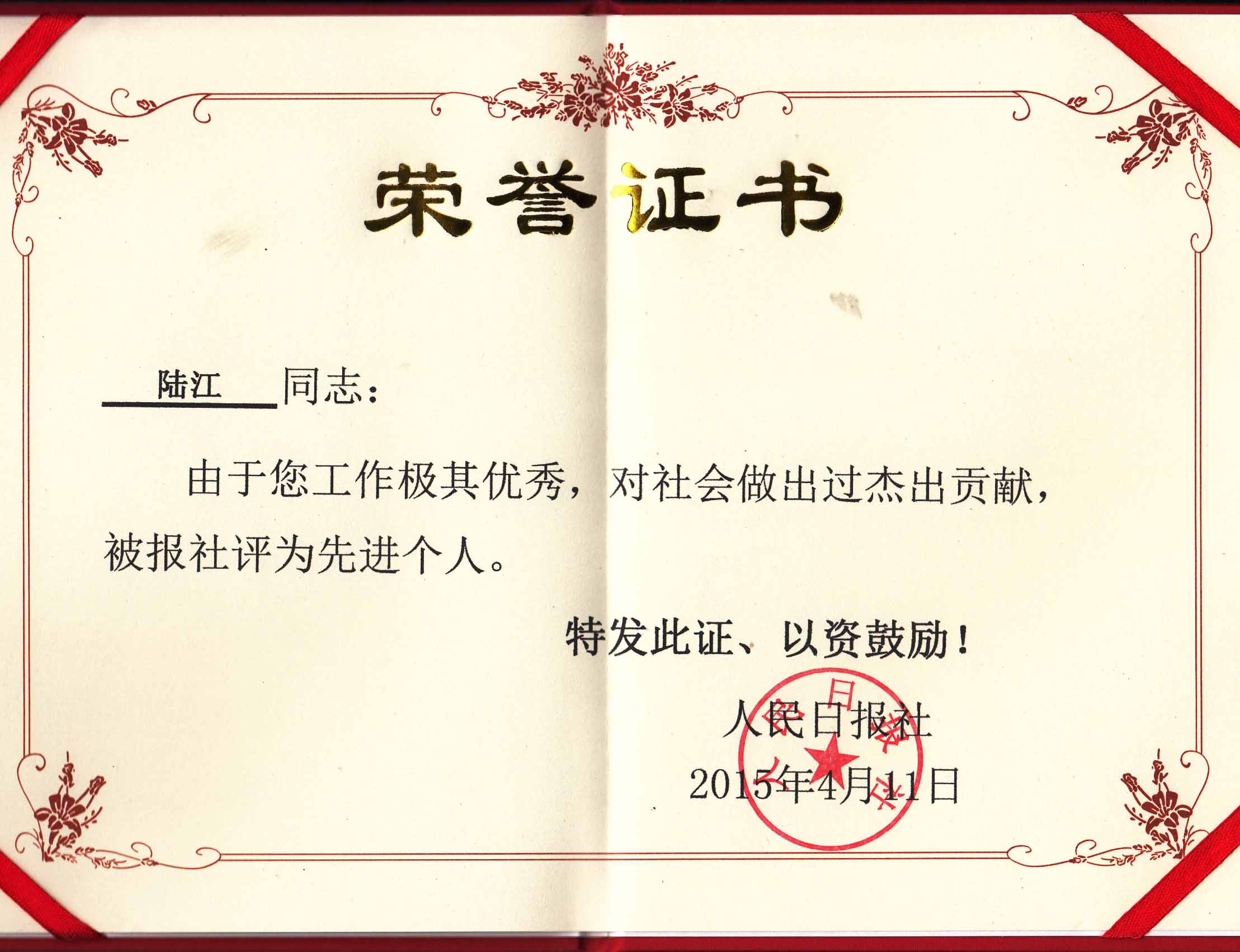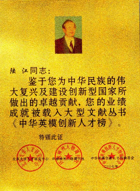 陸江的論文獲一等獎榮譽證書-- 陸江論文獲創(chuàng)新論文獎牌
