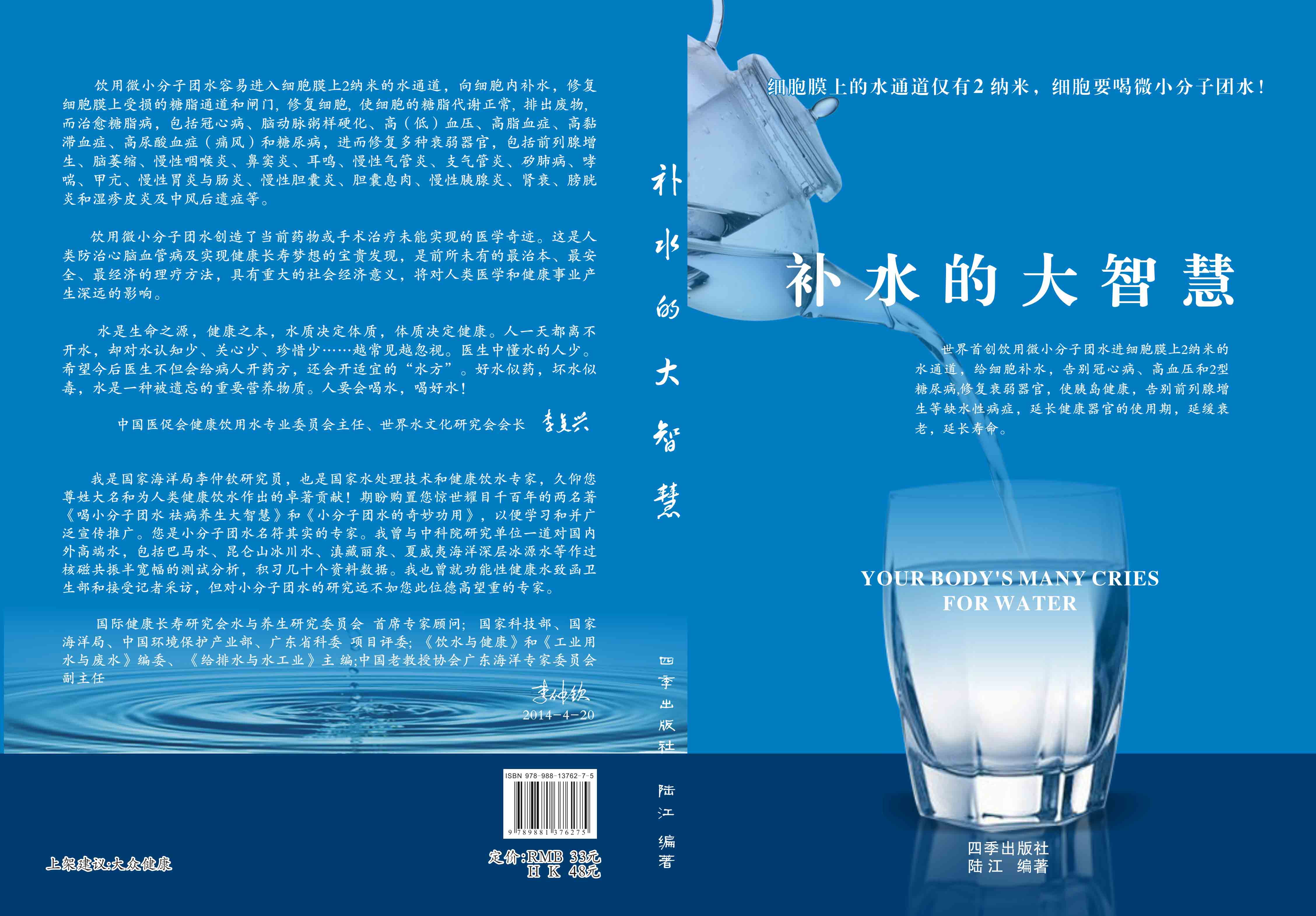----幾千年來,人們感到口渴才喝水,誤認為口渴是唯一的缺水信號,使喝水量偏少。很多人只知道補血補氣補腎補鈣補硒,而不知補水,逐漸使許多器官缺水,包括皮膚、動脈、氣管、膽囊、腸胃、骨關(guān)節(jié)、腎臟、前列腺和胰島缺水,以致患冠心病、高(低)血壓和糖尿病等缺水性病癥。美國F·巴特曼醫(yī)學博士寫有《水是最好的藥》一書很受歡迎,我國2007年譯成中文版,論述人體缺水引起許多病癥,他指導3000多患者喝水治愈了哮喘、胃炎和高血壓等病癥。而我是從2000年起,讓患者飲用微小分子團水,因為容易進細胞膜上2納米的水通道,治愈了許多缺水性的病。我跟蹤調(diào)查14年,發(fā)現(xiàn)凡是認真飲用和合理膳食,可治愈冠心病、高(低)血壓和2型糖尿病與衰弱器官并發(fā)癥及中風后遺癥。高血壓患者飲用2~5個月,癥狀消除,不再服藥,逐漸逆轉(zhuǎn)至消除動脈粥樣硬化,血壓正常穩(wěn)定,治愈了高血壓;冠心病人飲用3~5個月,消除心絞痛、房顫等癥狀,不再服藥,一年左右心電圖正常,經(jīng)冠狀動脈造影掃描表明冠脈內(nèi)無粥樣斑塊,真正治愈了冠心病;2型糖尿病人飲用3~10個月停藥,血糖尿糖正常,糖尿病痊愈。并且使前列腺增生、慢性咽喉炎、鼻竇炎、耳鳴、慢性氣管炎、支氣管炎、哮喘、矽肺病、慢性胃腸炎、膽囊炎、胰腺炎、腎衰、膀胱炎、風濕性關(guān)節(jié)炎、便秘、痔瘡和濕疹皮炎等不藥而愈,而無需終生服藥。飲用微小分子團水治愈的是長期吃藥治不好的病,彌補了幾千年來醫(yī)藥的欠缺,成為人類健康的寶貴資源。