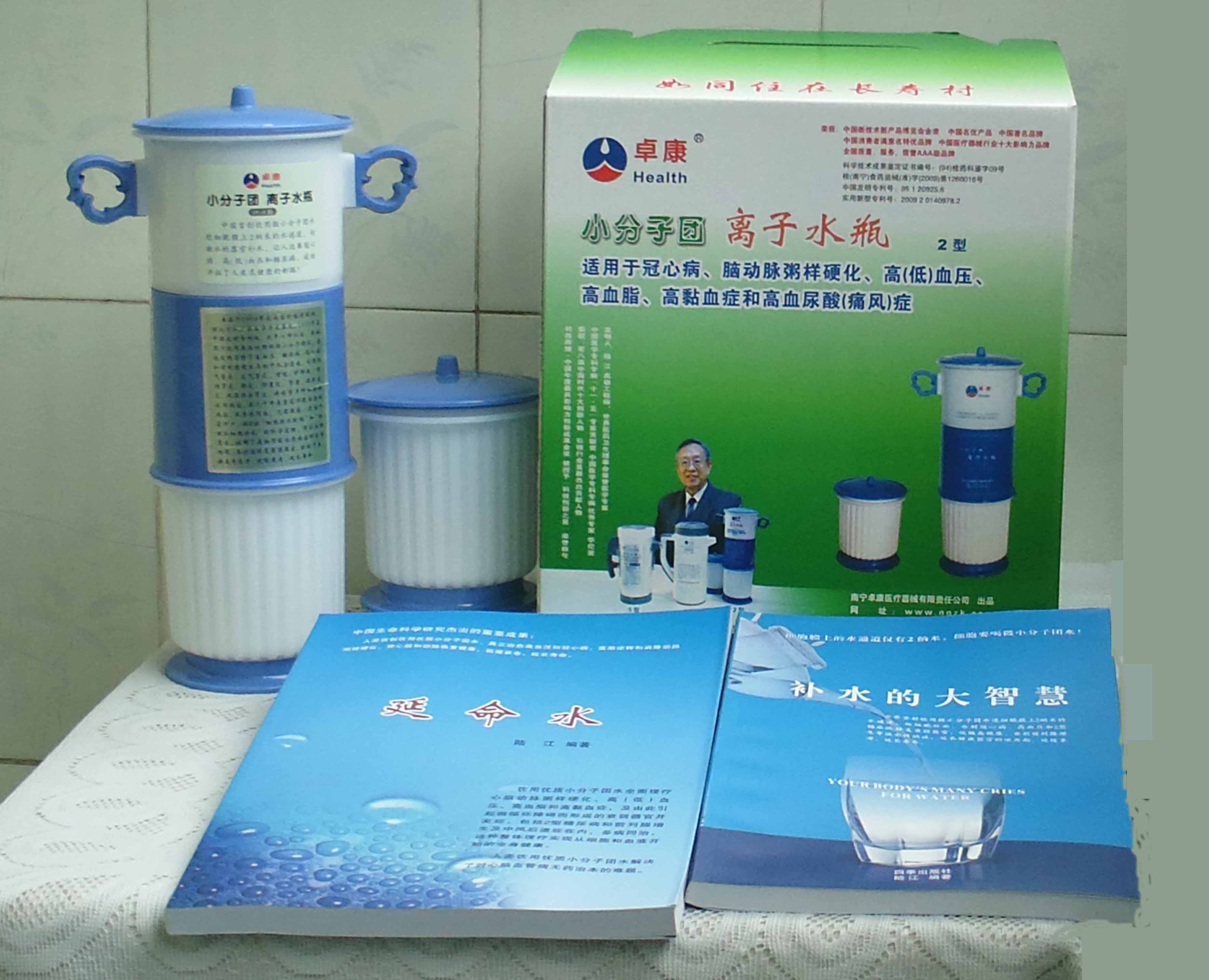 本品大量用戶的使用效果表明,能治愈冠心病、腦動脈硬化、原發(fā)性高(低)血壓、高血脂、高粘血癥、高血尿酸癥(痛風)和2型糖尿病、衰弱器官并發(fā)癥(前列腺增生、腎衰與尿毒癥)及中風后遺癥等療效好。產(chǎn)品配信譽卡。使用壽命30年,不換芯,易清洗。團購優(yōu)惠。從郵局匯款,匯費1%,地址按本頁下方地址、聯(lián)系人寫。從銀行匯款,請點擊[聯(lián)系匯款]欄,從工商銀行匯款,建設(shè)銀行、農(nóng)業(yè)銀行匯款,均免收匯費,匯款后20--30分鐘內(nèi)發(fā)短信,可用微信轉(zhuǎn)帳,均免匯費,微信號即手機號13768308380。匯款后,告知你的姓名和地址,我公司聯(lián)系人手機號是:13768308380。卓康牌離子水瓶為我公司獨家生產(chǎn),郵購產(chǎn)品配《補水的大智慧》彩印書一本,另配四季出版社出版的新書《補水的大智慧》一本,并配光盤一張(含央視主持人釆訪陸江的對話視頻)。目前市場和"淘寶網(wǎng)"上有人兜售假冒的偽品,望讀者審察辯別真?zhèn)危旒僬哓飧`假冒本公司的各種認證、獲獎獎項、專利號和外包裝盒上的中英文字,包括科技成果的鑒定意見等,請讀者注意防偽。如何識別假貨?已經(jīng)買了假貨怎么辦?(請點擊[打假掠影][打假掠影])。