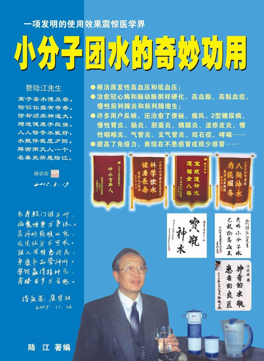 人類幾千年來患以上病癥需終生服藥,幾十年也不能治愈。可是我國南寧的高級工程師陸 江,于1990年想根治高血壓,研究發(fā)明了離子水瓶,處理出微小分子團水供飲用,經(jīng)過醫(yī)院臨床試用和專家鑒定,1999年獲中國發(fā)明專利權(quán),產(chǎn)品于2000年投放市場后一直跟蹤調(diào)查,據(jù)全國各地用戶反饋:祛除了高低血壓、糖尿病和冠心病,并使前列腺增生、咽喉炎、鼻竇炎、慢性氣管炎、支氣管炎、矽肺病、哮喘、慢性胃炎、腸炎、慢性膽囊炎、慢性腎炎、腎衰、膀胱炎、便秘、痔瘡、風濕性關(guān)節(jié)炎和濕疹皮炎及中風后遺癥等病癥不藥而愈。為什么喝微小水能治20多種病?陸 江從1991年德國科學家發(fā)現(xiàn)細胞膜水通道僅為2納米獲得啟發(fā),認為多種器官患病是因細胞脫水,不能正常代謝和分裂增殖,才使器官細胞減少致衰弱萎縮而形成細胞缺水性病癥。22年來的實踐有力地支持了“細胞脫水致病”這一重要論點,表明喝微小水可滿足細胞的生理需求,補水就能祛病,是生命科學新亮點。